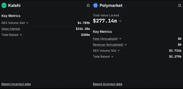 根據DefiLlama的數據,目前Kalshi與Polymarket的月交易量分別來到約47.85億美元與37.34億美元,顯示此產業已不再是加密圈的小眾產品,而是足以吸引華爾街與大型科技公司的新興商品。