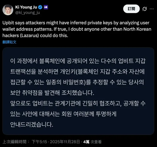 南韓最大加密貨幣交易所Upbit上週四(11/27)遭遇重大安全事件, 官方確認旗下熱錢包系統存在「可推算私鑰」的嚴重漏洞,恐讓攻擊者透過分析鏈上交易紀錄,反推出錢包的私鑰。