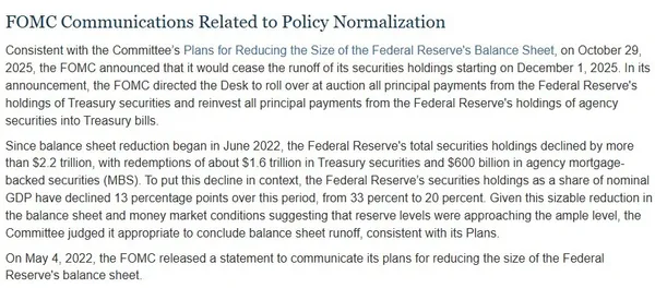 美國聯準會(Fed)根據10月底召開的聯邦公開市場委員會(FOMC)決策,已於美國時間2025年12月1日,正式結束量化緊縮(QT)政策。