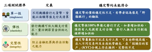 此外,穩定幣採100%準備發行,無法像央行一樣具備調節資金供給的彈性,且在KYC合規上存在漏洞,容易成為洗錢工具。