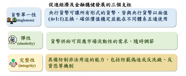 - 單一性是指央行貨幣能確保所有形式的貨幣(如商業銀行存款、電子支付餘額)皆能以面值1:1進行互換,這也是貨幣體系穩定的關鍵