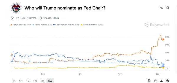 截至12月5日,在Polymarket等預測市場平台上,哈塞特當選的機率約為75%;彭博等主流媒體此前也援引消息人士稱,哈塞特已經成為接替鮑爾的「頭號熱門」。而川普本人則在公開場合表示已經做出決定,將在2026年初正式宣布人選,並多次在採訪中點名稱讚哈塞特。