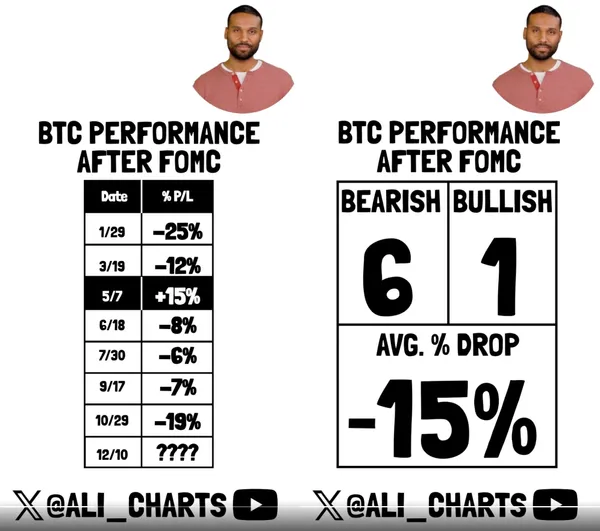 即便市場普遍看好降息,比特幣歷史走勢卻顯示另一面向。分析師Ali Martinez整理今年7次FOMC會後的市場反應,其中6次比特幣都在會後出現大幅回調,平均跌幅達15%。其中最大一次是1月會後下跌25%,最近一次則是10月降息後比特幣重挫19%。