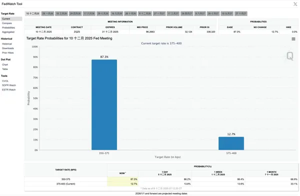 加密市場本週迎來關鍵時刻,聯準會將於本週三公佈利率決策,市場押注本次將再度降息25個基點,CME FedWatch的數據顯示降息機率高達87.3%。