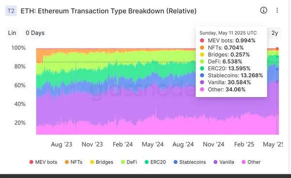 而透過對以太坊鏈上資金類別的分析可以看出,以太坊鏈上有接近一半的交易是由穩定幣和ETH轉帳完成的。且穩定幣的交易佔比明顯在增加,DeFi和ERC-20代幣的交易佔比實際上仍在下降。這也說明,以太坊仍在向鏈上的資產價值儲存中心的角色進行轉變,而MEME和應用類的發展似乎受到了限制。由此看來,以太坊一直以來試圖透過降低手續費,提升交易速度的方式提振活躍度的策略或許很難奏效。