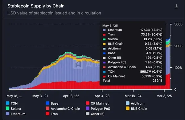在鏈上DEX交易量方面,以太坊主網在進入2025年後明顯進入了活躍期。這一週期的活躍度明顯高於2024年的表現,接近2021年到2022年的高峰期。不過從收入的數據來看,近期的交易活躍度上升主要來自於穩定幣相關的交易,USDT近30天在以太坊上產生了5.68億美元的費用。截至5月18日,以太坊仍是穩定幣發行量最大的公鏈,佔比超過50%,總發行量達到了1,273億美元,是以太坊DeFi TVL的兩倍。