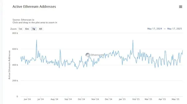 從鏈上的活躍度來看,以太坊活躍地址的變化並不明顯,目前的數值仍在每日40萬到60萬之間的區間波動。這種波動法則已經維持了超過1年的時間,不過在近期的波動曲線有突破60萬區間的走勢。