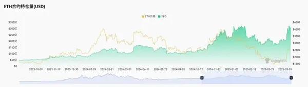 雖然近期的價格反彈距離歷史高點還有較大的距離,但在合約持倉量上,卻在近期達到了歷史高點水準。 5月14日,以太坊合約持倉量達到322.49億美元,幾乎是史上最高的合約持股水準。上次合約量達到這個數值也是在2025年1月~2月,彼時以太坊的價格在3000~3800美元的區間波動。由此也可以看出,市場還是十分熱衷於在以太坊上下注。