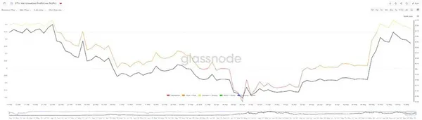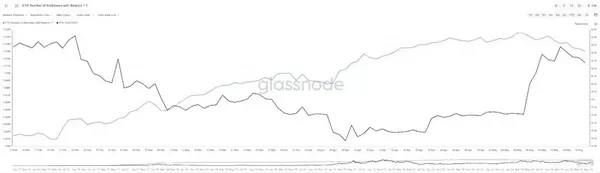 另一個較有趣的數據是,以太坊鏈上餘額大於1個的地址數隨著價格反彈反而迎來了下跌,而在此前價格下跌的過程中,這個數據始終在上漲,說明不少投資者還是選擇在下行階段抄底。而當價格上漲至1,800美元之後,部分地址選擇獲利出局。不過這個比例下降的不算很高,只有約千分之一左右。隨著價格回升,目前以太幣的獲利地址百分比已經達到了60%。