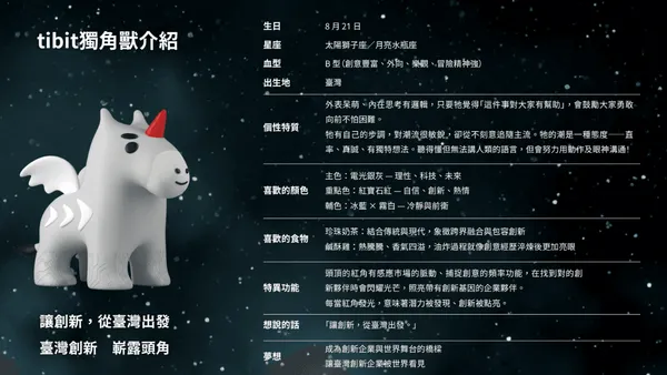 8月21日出生,B型太陽獅子。它擁有敏銳的美感與創意直覺,更對於潮流、科技與文化的變化特別敏感,總能在細節裡捕捉靈感再用獨特風格詮釋創意。它叫tibit,是來自臺灣創新板的全新獨角獸IP。只是這隻獨角獸的任務,從一開始就不只是「可愛」這麼簡單。