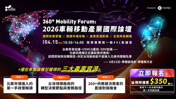 360° MOBILITY FORUM|2026 車輛移動產業國際論壇-國際政策掌握 x 關鍵市場攻略 x 產業資源對接 x 生態佈局戰略
